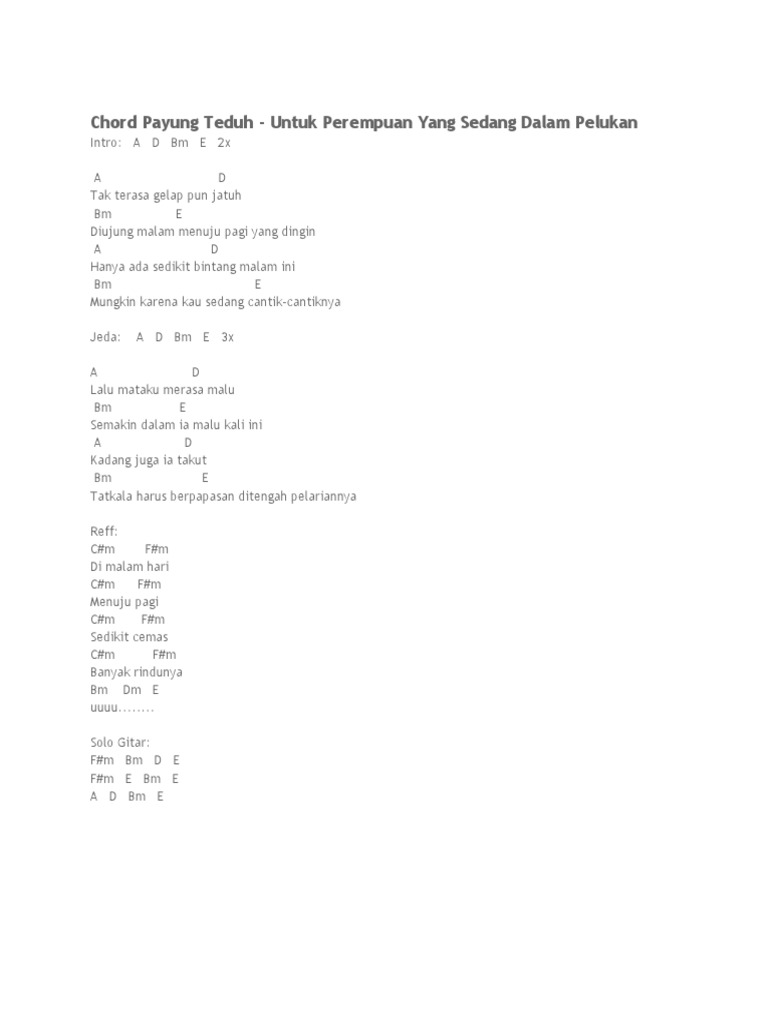 Payung teduh akad chord ini telah disederhanakan agar sobat mudah untuk memainkan dan menyanyikannya. Intro G Fm Em A D G C A Dmaj7 Ddim7 Em Ada yang tak sempat tergambarkan A Dmaj7 Oleh kata ketika kita berdua Ddim7 Em Hanya aku yang bisa bertanya A Dmaj7 Mungkinkah kau tau jawabnya Ddim7 Em A Malam jadi saksinya Dmaj7 B7 Kita berdua diantara kata yang tak terucap Em A Fm Bm Berharap waktu membawa. Kunci Gitar Payung Teduh - Untuk Perempuan Yang Sedang Dalam Pelukan Chord Dasar.